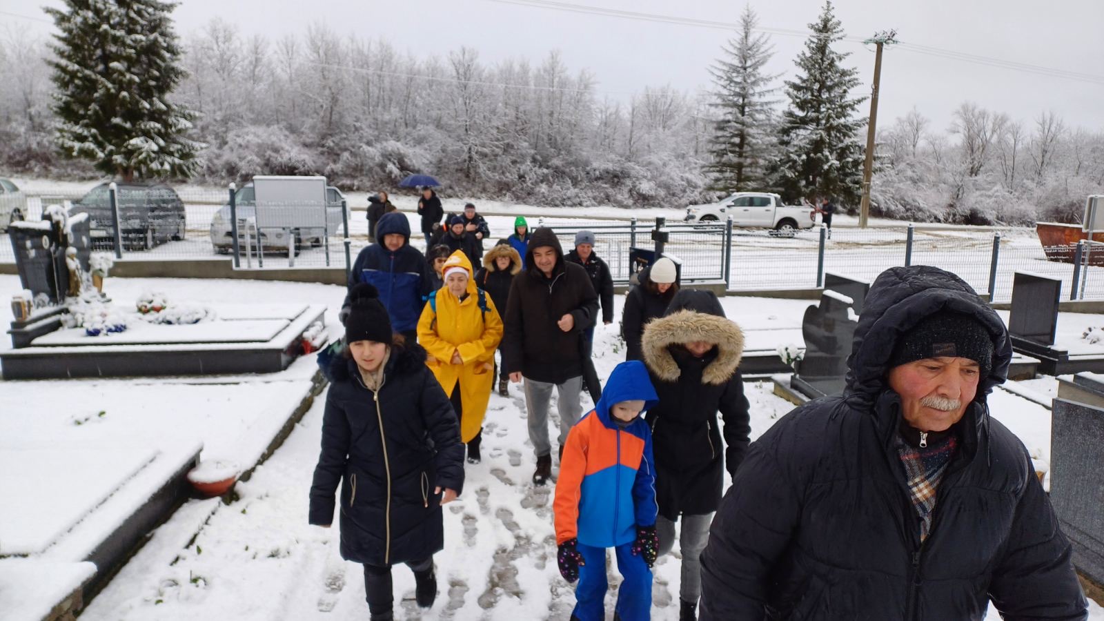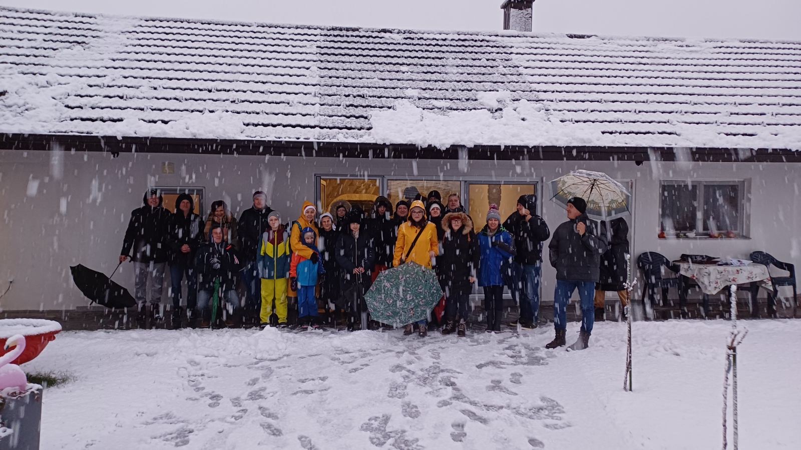 I nakon kave idemo dalje, a snijeg pada li ga pada. Već je i druga i treća, pa i četvrta krunica. A snijeg i dalje pada. Malo je umanjio. Neki su se malo umorili. Plaču. Al tu je tata da ponese svoje dijete, pa nema više ni suza ni plača, samo smijeh.